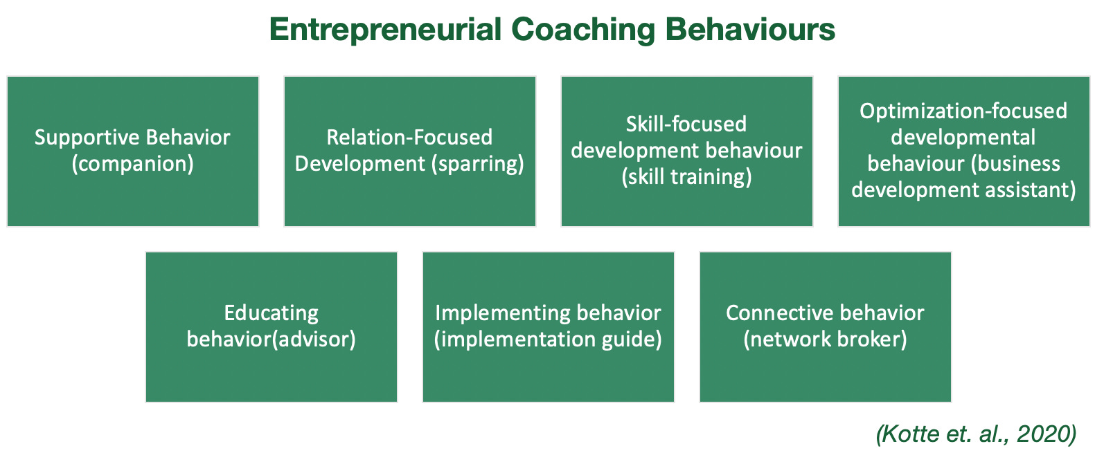 Entrepreneurial Coaching: The beneficial behaviours of Entrepreneurial Coaching were identified in research published in Applied Psychology in 2020 (shown below).